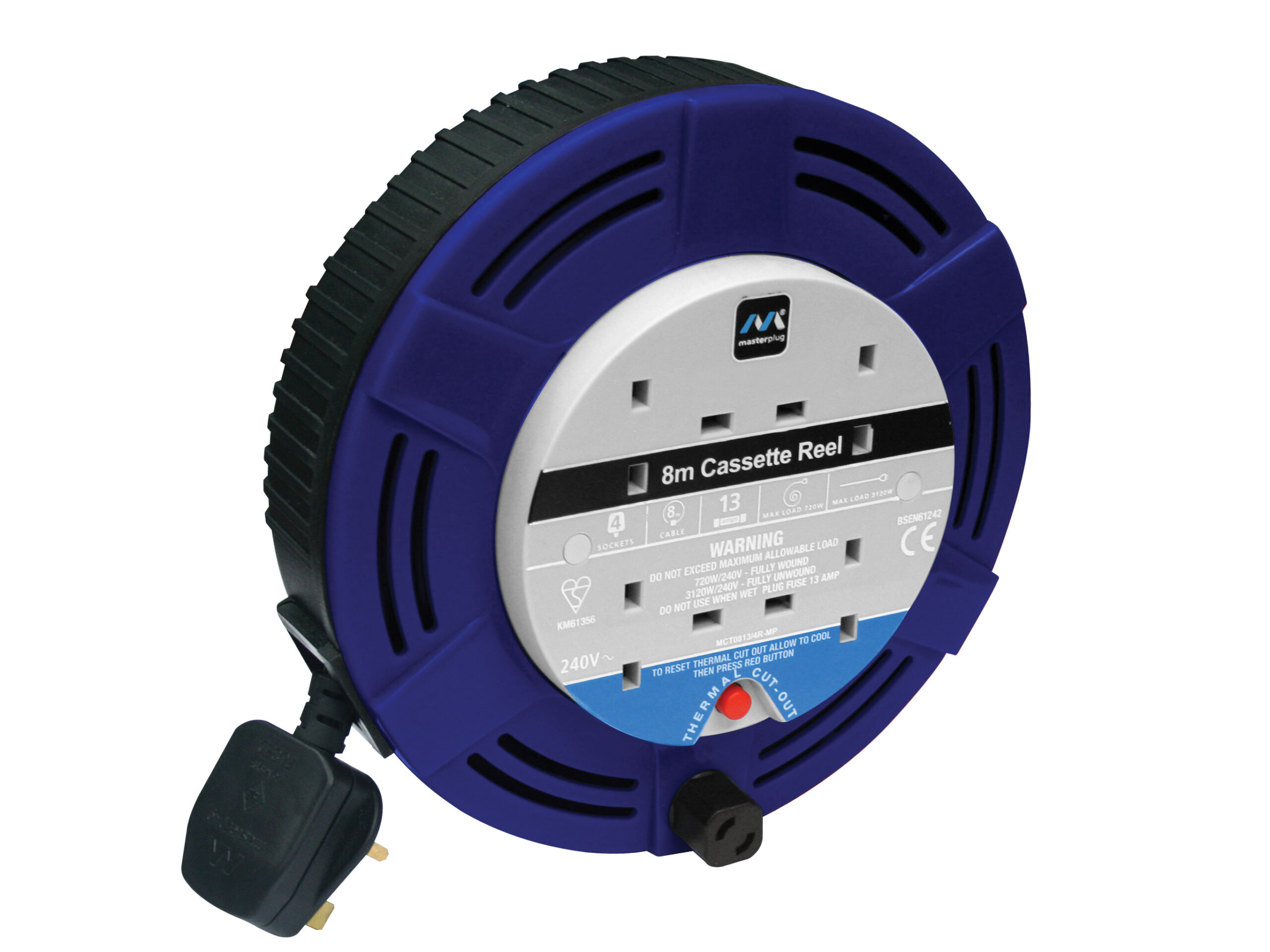 MASTERPLUG Cassette Cable Reel 240V 13A 4-Socket Thermal Cut-Out Blue 8m