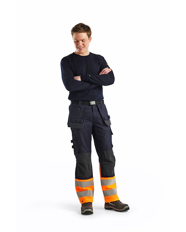 They feature many smart pocket solutions designed to meet certification standards. Pockets subject to excessive wear are reinforced with double thickness to extend their life. The trousers have tool pockets, an open ruler pocket and flapless rear pockets. Ripstop fabric delivers exceptional tear strength.