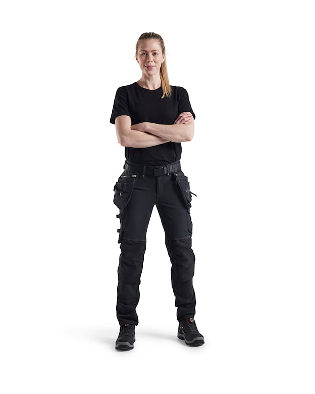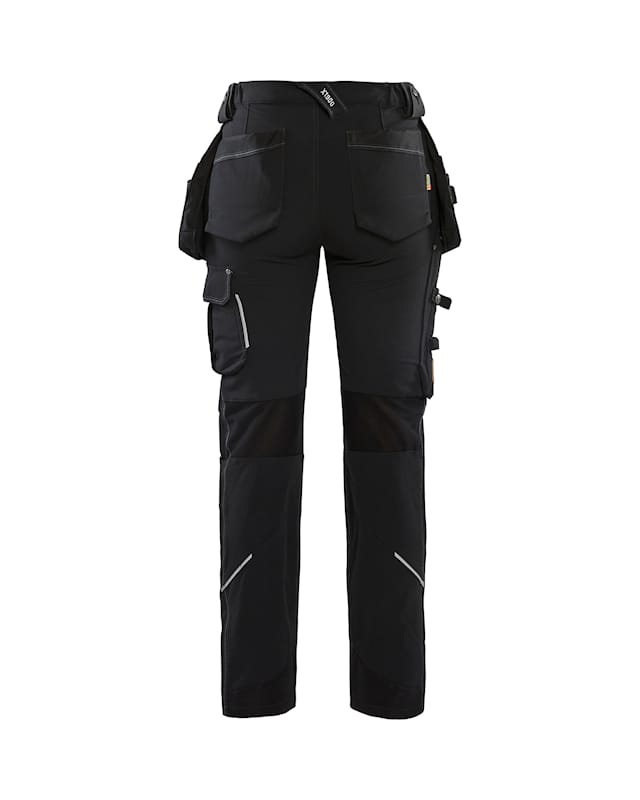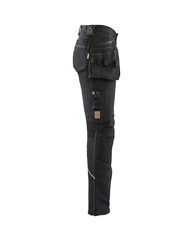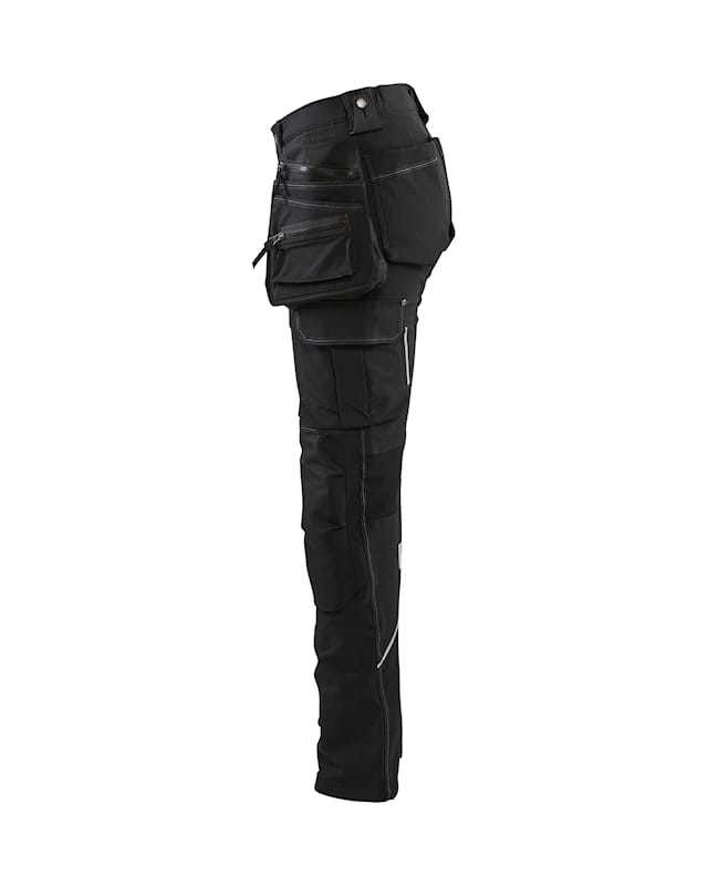 The material is a smooth 4-way-stretch fabric which is strong and stretchable in all directions. The trousers have advanced details and practical reinforced pockets, a ruler pocket, front pockets and functional tool holders, for example loops to hold hammers.