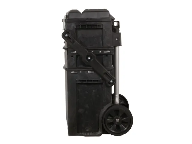 The telescopic handle provides easy manoeuvrability. It opens up easily into a 4-level workstation, with a giant lower bin, which is for bulky materials and equipment such as paint cans, large components and power tools. There is a toolbox with a lift out tray for smaller tools, which fits neatly in to the fold out lid, along with a large adjustable organiser for nails, screws and other small components.