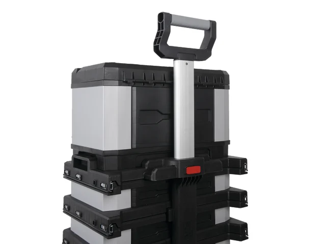 The Stanley FatMax® Rolling Workshop is fitted with heavy-duty road tested wheels for durability and stability. An extendable handle offers the user easy manoeuvrability. Stanley have fitted metal latches to the mobile workshop which are designed to provide a long working life. This mobile tool chest has the additional feature of a top section toolbox with a plastic lift out tray for smaller tools. This fits neatly into the fold out lid. A good all-round storage system for home owners and tradesmen that will hold a comprehensive range of hand and power tools.