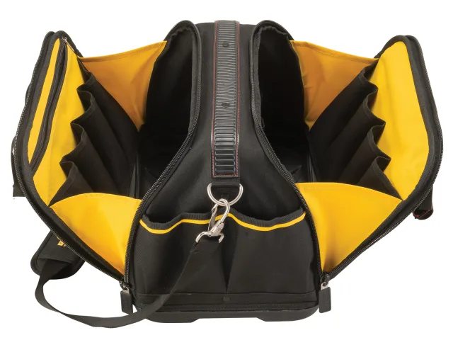 The Stanley FatMax® Multi Access Bag features dual side opening storage space, with two separate main wide opening compartments providing a large storage space for hand tools/power tools. It has a free-standing rigid structure with a reinforced plastic base to protect from water and dirt. There are multiple pockets for easy and convenient organisation of tools. Other features include a closed secure front pocket, padded shoulder strap and multiple internal and external pockets and loops.