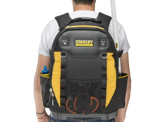 The Stanley FatMax® Tool Backpack has a zip fastening design from top to bottom that allows the backpack to open in two halves. There are compartment pockets inside to hold tools securely and tidily. Made from durable 600 x 600 denier fabric with a waterproof plastic bottom. Will stand up to all worksite and weather conditions, giving the tool bag a longer life.