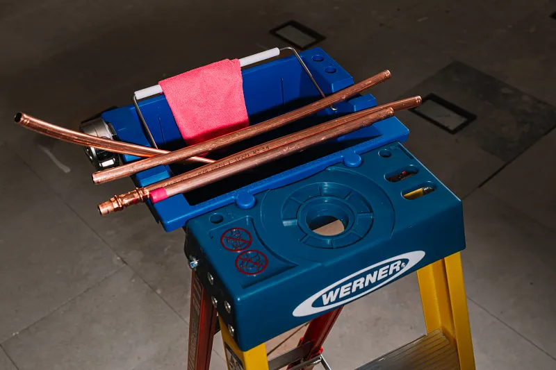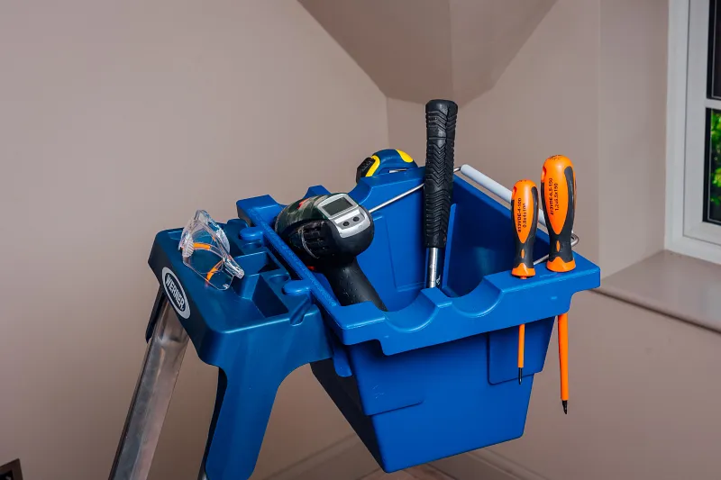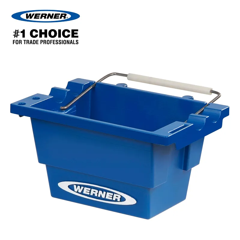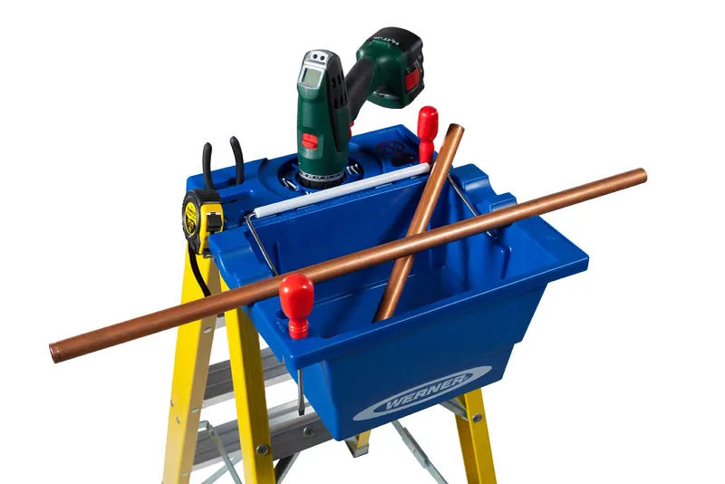 The Werner Lock-In Job Bucket fits right into the ladder top customising your work space. Integrated tape measure and screwdriver holders are features of the job bucket along with top grooves to hold round pipes in place. Great for all trades—electrical, maintenance, plumbing and construction.