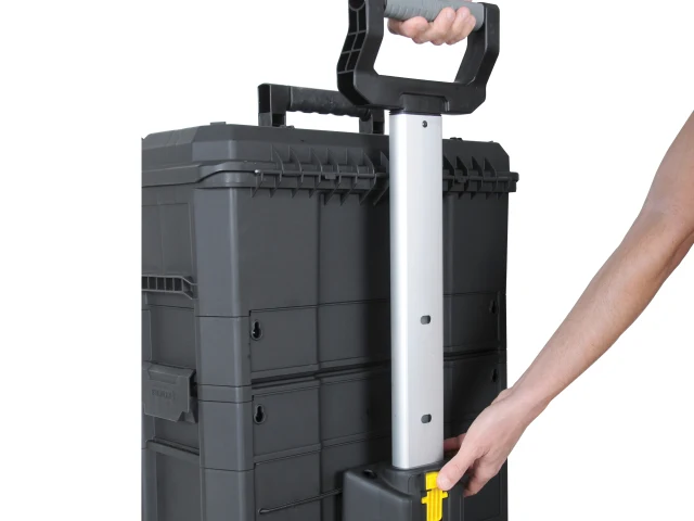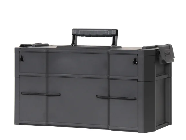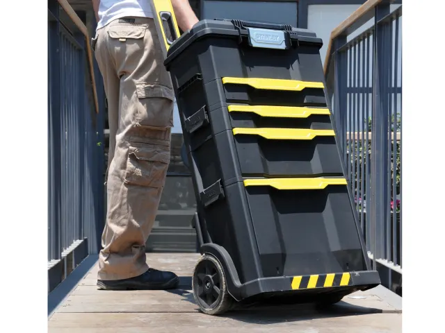 The Stanley 79-206 Rolling Workshop has portable detachable containers with a handle on top allowing for customised storage options and to carry only the options you need. The top detachable tool box has a drawer and one hand operation latch, 2 drawer storage unit with shallow and deep drawer and bottom flip bin with back pocket for long tools storage (saw & level) – versatile organisation for various sizes of tools and small parts.