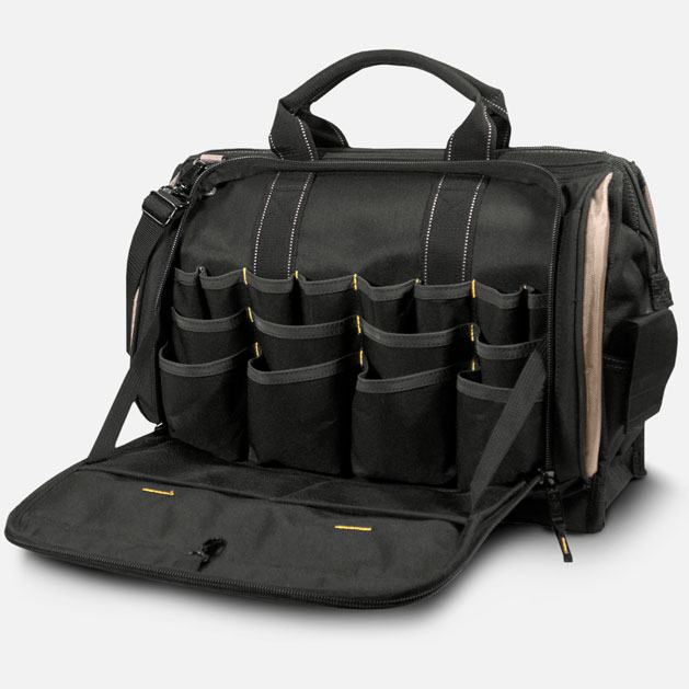 Our popular multi-compartment tool carrier with a large center compartment for power tools and two zippered side panels with multiple pockets for all your favorite hand tools has padded handles and an adjustable shoulder strap.