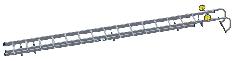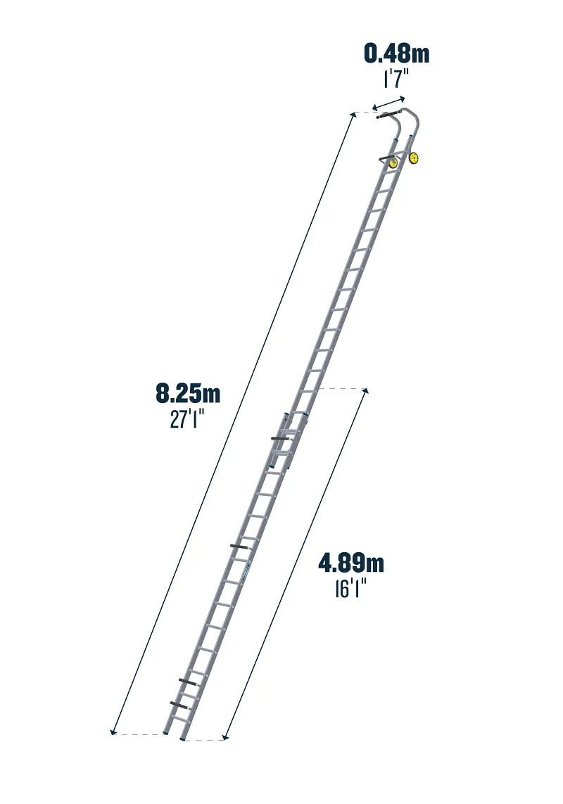 The 77100 Series Double Section Roof Ladder has an optimum weight frame for ease of positioning with no compromise on strength. Fitted with a heavy-duty roof hook with large non-slip rubber end bar for a superior apex fit. Heavy-duty locking catches and non-slip rubber sleeved support bars for roof protection. Large wheels for easy manoeuvring on roof. Compact for easy storage and transportation. Available in 3.21m, 3.77m, 4.33m, and 4.89m overall length.